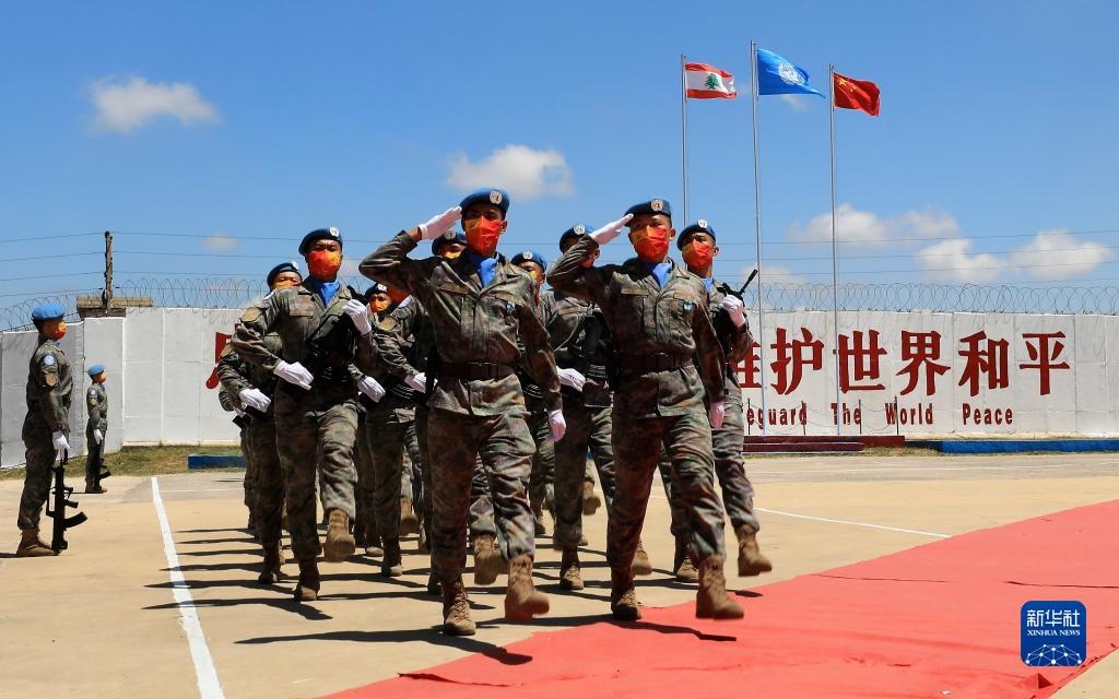在黎巴嫩南部辛尼亞村的中國維和部隊營區(qū),中國維和部隊官兵在受勛后通過觀禮臺(2022年7月1日攝)。新華社記者 劉宗亞 攝