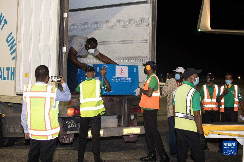 工作人員在圭亞那首都喬治敦國際機(jī)場搬運中國援助的新冠疫苗(2021年3月2日攝)。新華社發(fā)(圭亞那新聞署供圖)