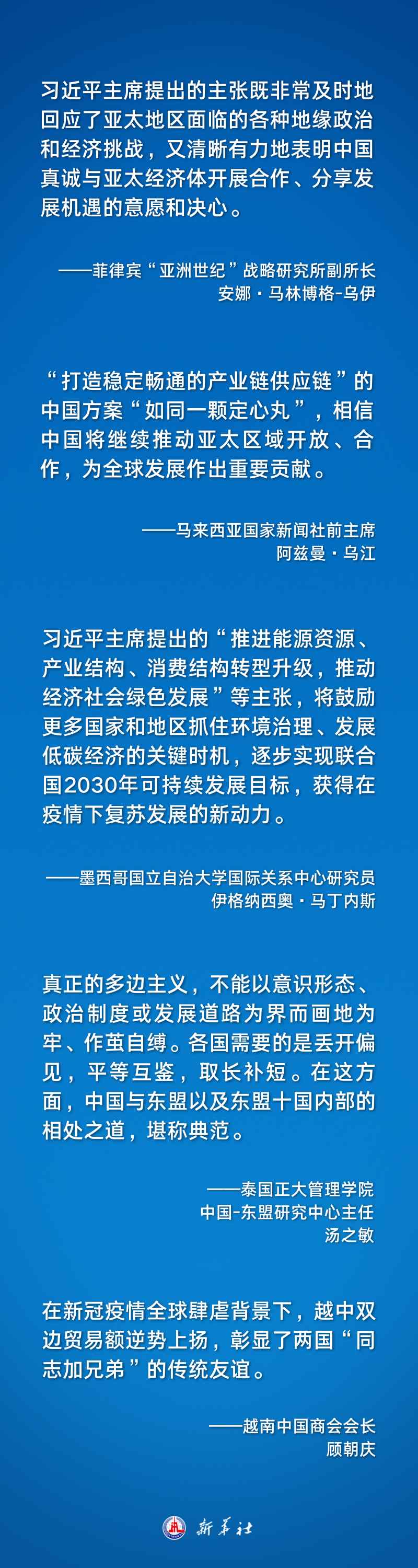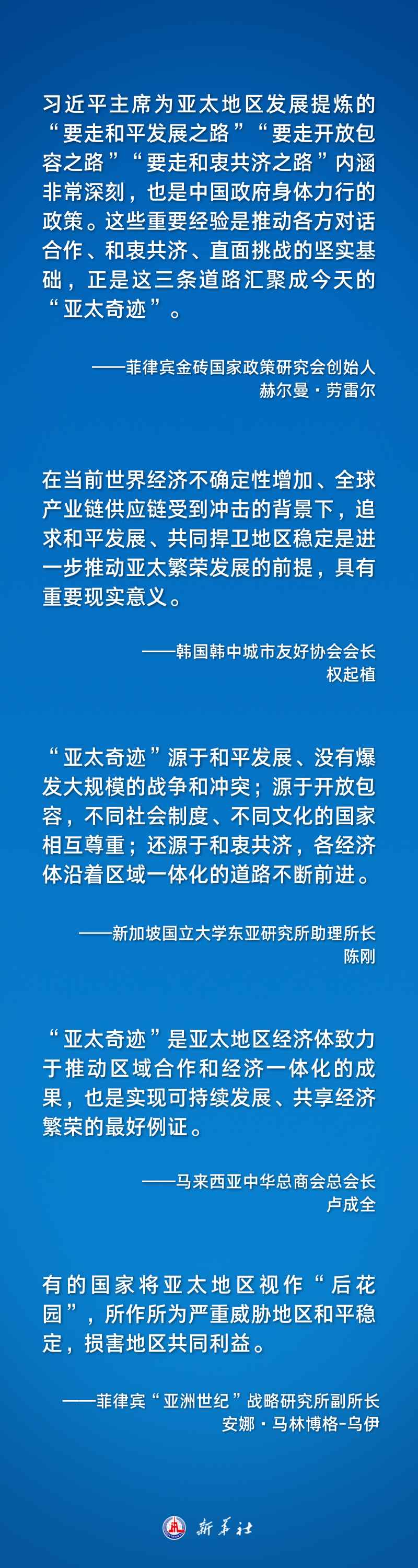 習近平主席的系列重要講話在國際社會引發(fā)熱烈反響。多國人士認為,習近平主席全面總結(jié)了“亞太奇跡”的經(jīng)驗與啟示,就攜手構(gòu)建亞太命運共同體提出重要主張,深刻闡釋了中國式現(xiàn)代化的機遇與貢獻,為再創(chuàng)亞太合作新輝煌注入強勁動力。