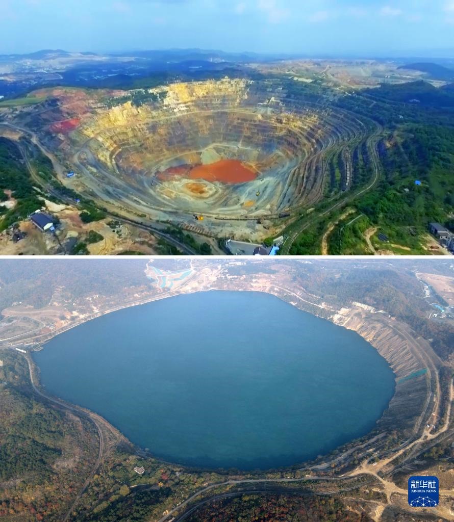 拼版照片:上圖為開采中的安徽省馬鞍山市雨山區(qū)向山鎮(zhèn)凹山采場(資料照片),下圖為生態(tài)修復后的凹山采場(新華社記者劉軍喜11月8日攝,無人機照片)。新華社發(fā)