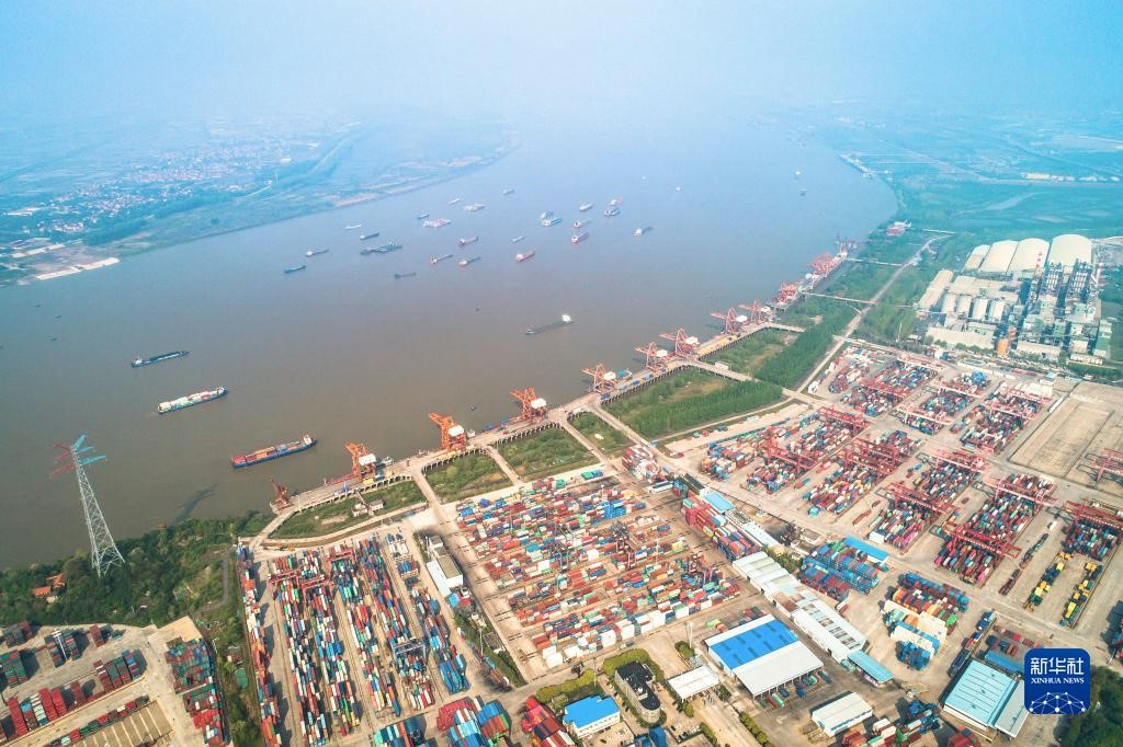 這是武漢長江中游航運中心核心港陽邏港(2020年4月12日攝,無人機照片)。新華社記者 肖藝九 攝