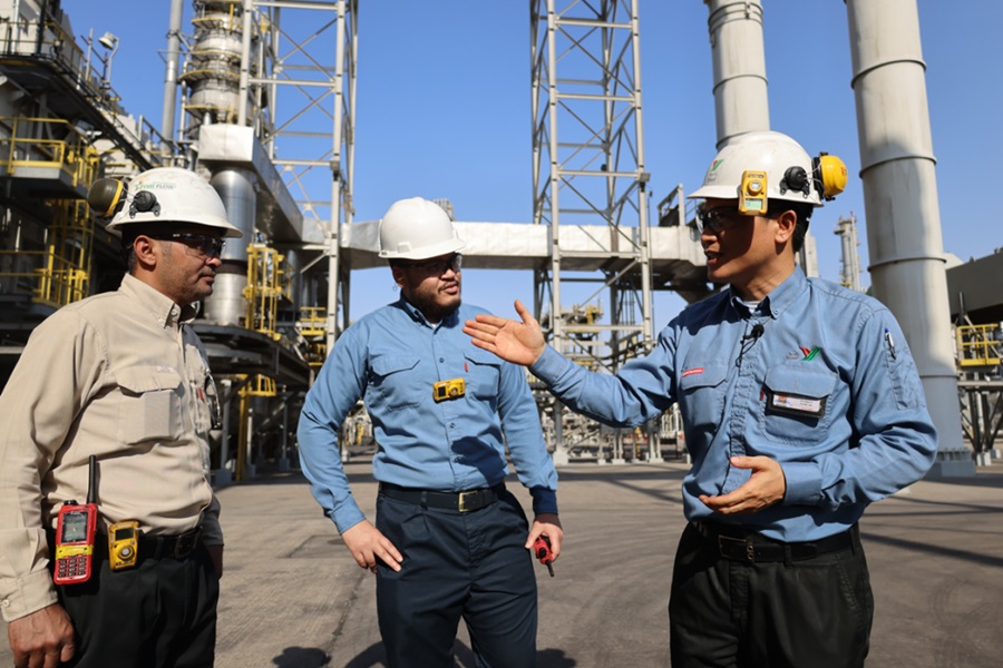 2022年11月27日,在沙特西部城市延布,中沙延布煉廠的員工在交流。總投資86億美元的中沙延布煉廠是中國石化與沙特阿拉伯石油公司合資興建的項目,自2016年1月20日由兩國元首共同啟動投產(chǎn)以來,發(fā)展迅速。今年1月至8月累計實現(xiàn)利潤11.5億美元。