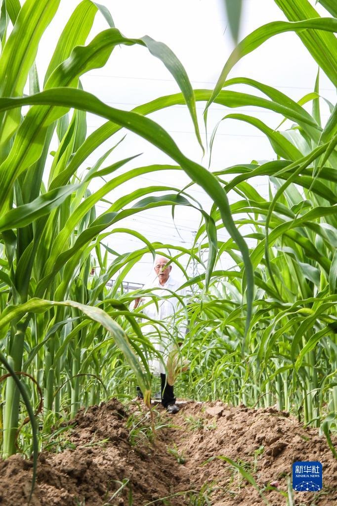 玉米育種專(zhuān)家程相文在海南三亞南繁科研育種基地觀察玉米生長(zhǎng)情況(2022年12月15日攝)。新華社記者 張麗蕓 攝