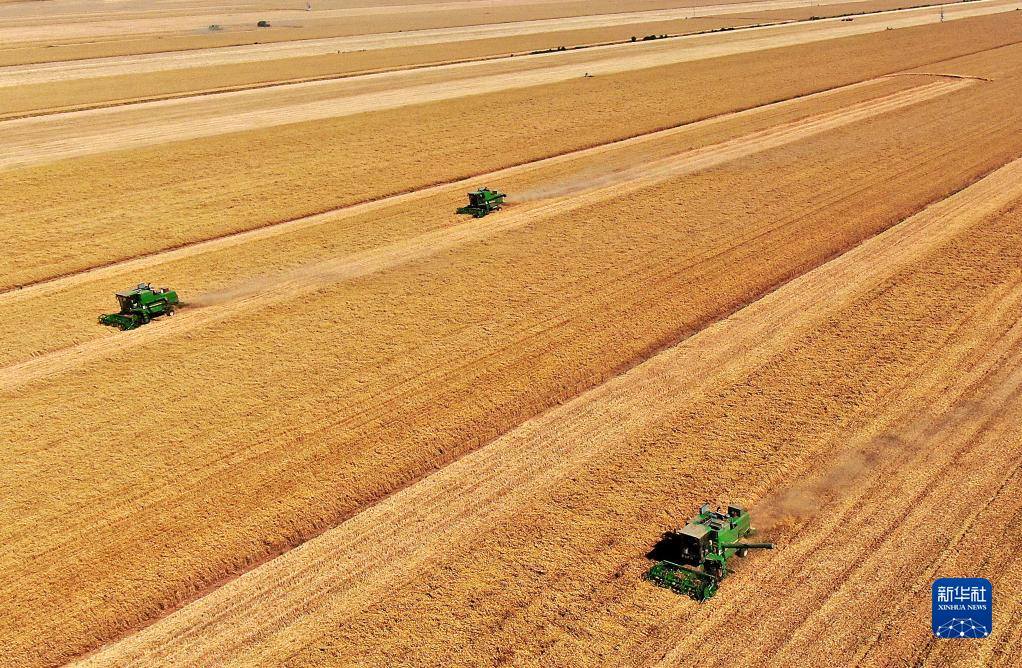 在河南省安陽(yáng)市湯陰縣菜園鎮(zhèn)高標(biāo)準(zhǔn)農(nóng)田示范區(qū),收割機(jī)在麥田作業(yè)(2022年6月8日攝)。新華社記者 郝源 攝