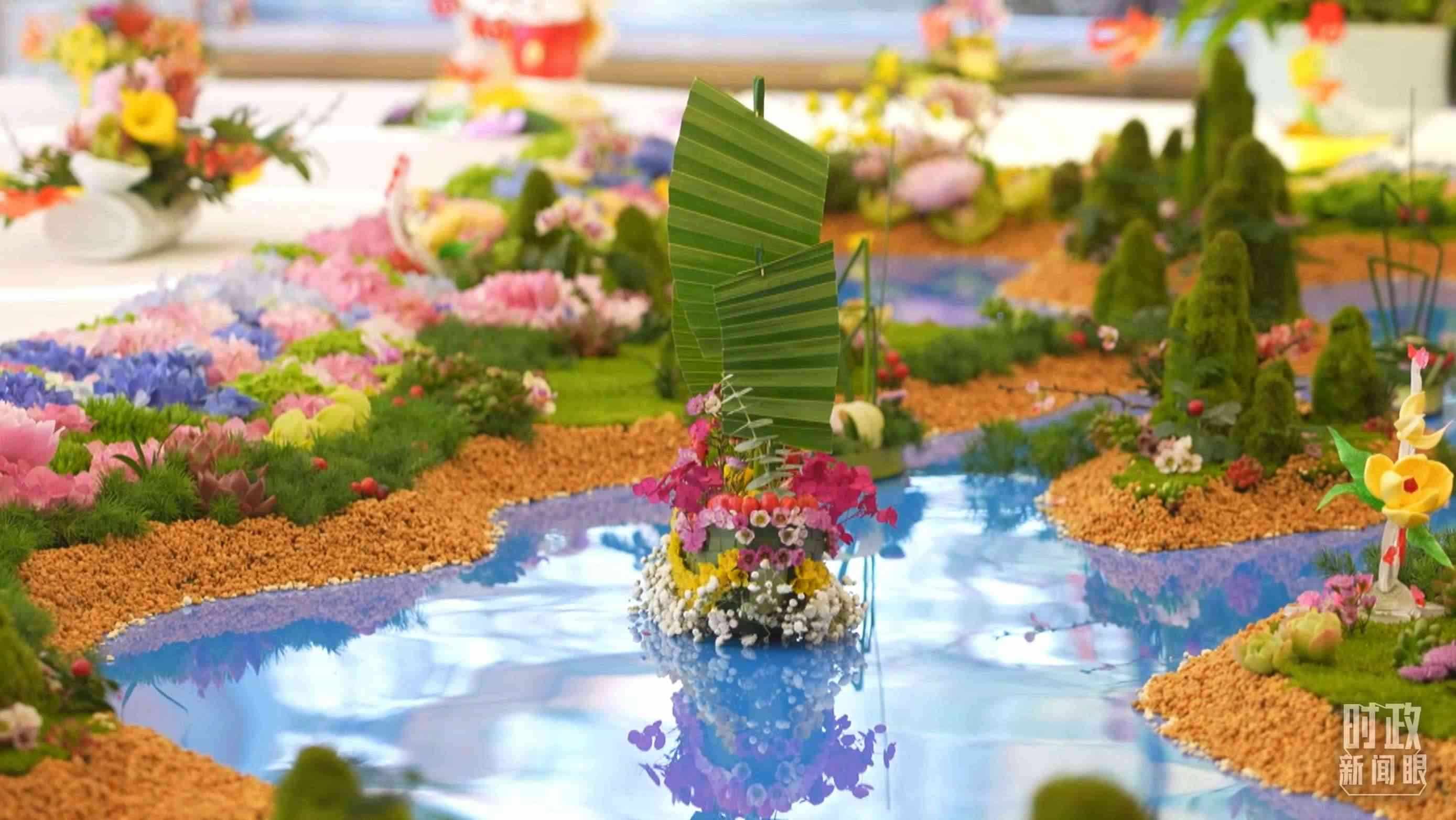 △2月10日會見結束后,習近平為洪森舉行了宴會。這是宴會現(xiàn)場的帆船造型。(總臺央視記者蔣碩拍攝)