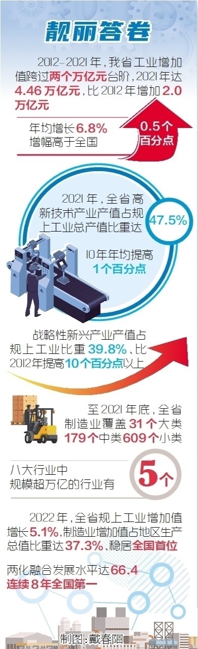 制造業(yè)規(guī)模實(shí)力保持領(lǐng)先。我省把制造業(yè)高質(zhì)量發(fā)展擺在更加突出位置,加快傳統(tǒng)產(chǎn)業(yè)轉(zhuǎn)型和戰(zhàn)略性新興產(chǎn)業(yè)發(fā)展,推進(jìn)產(chǎn)業(yè)邁向中高端水平。工業(yè)增加值10年跨過3萬億、4萬億兩個(gè)臺(tái)階,2021年達(dá)4.46萬億元,比2012年增加2.0萬億元,年均增長6.8%,增幅高于全國0.5個(gè)百分點(diǎn)。