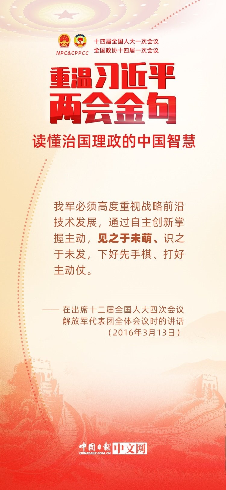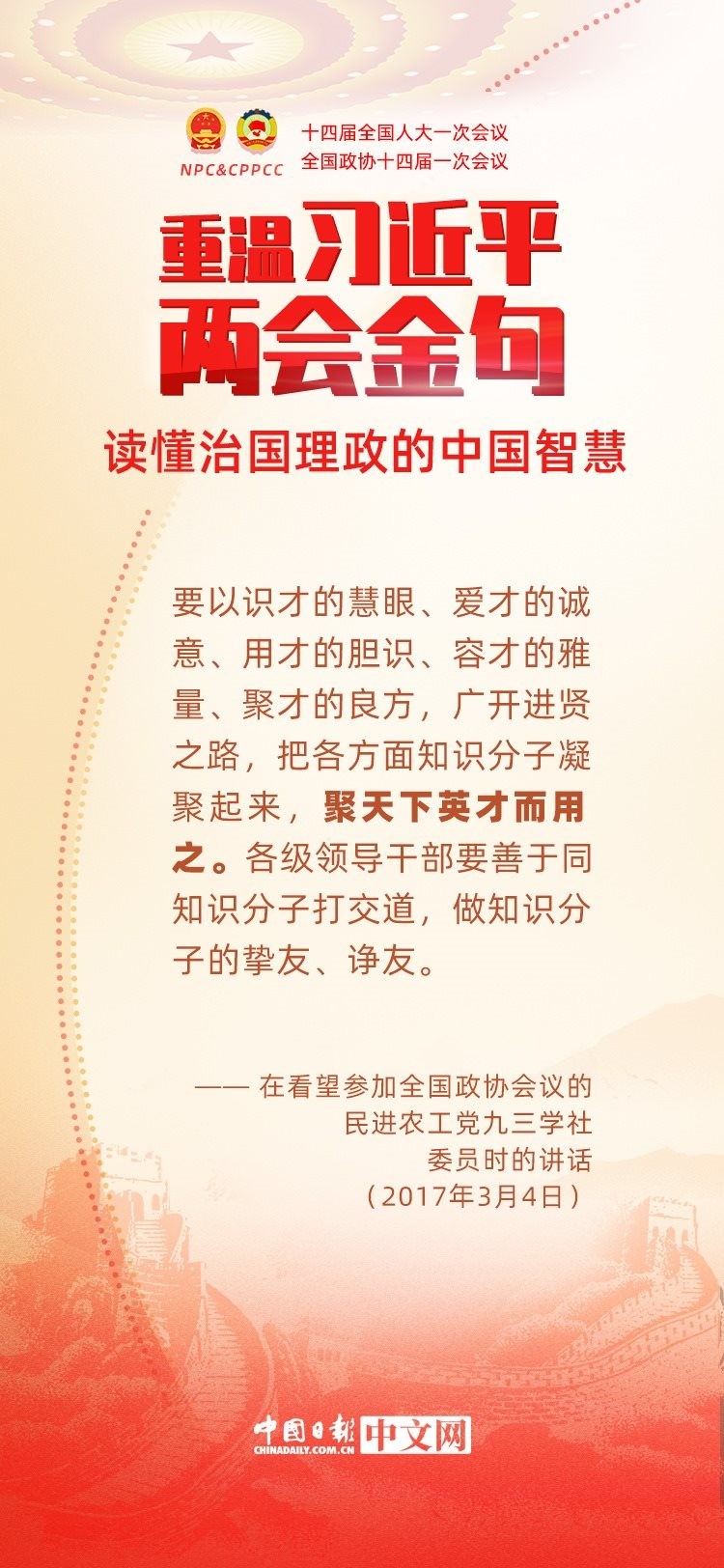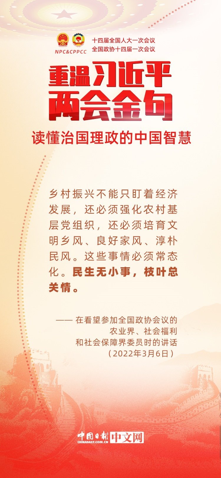 黨的十八大以來,每年兩會(huì)期間,習(xí)近平總書記都要與代表委員共商國是。十年來,在一系列重要論述中,習(xí)近平總書記使用詩詞、古語等典故,把中華優(yōu)秀傳統(tǒng)文化融入治國理政的理論和實(shí)踐中。