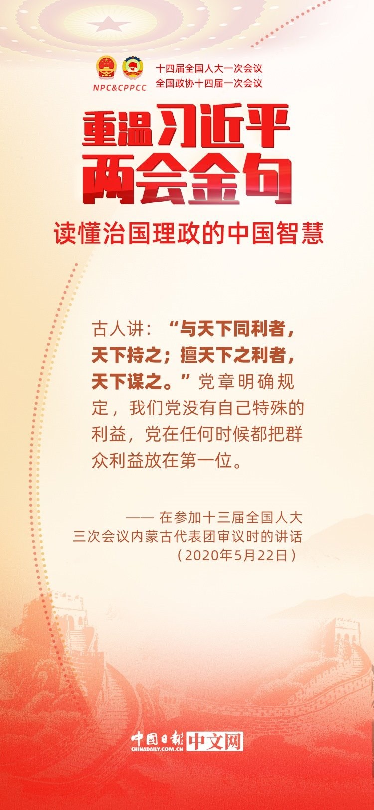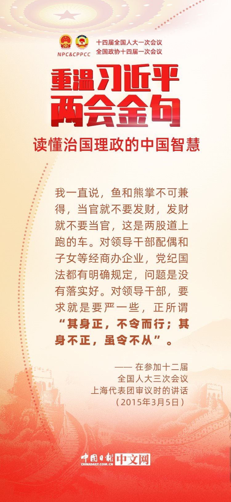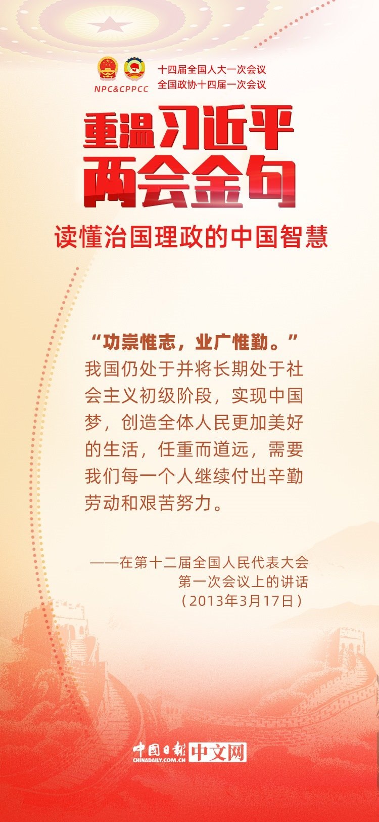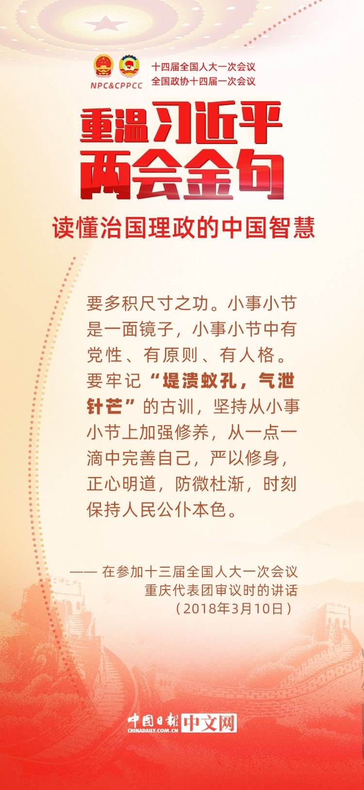 黨的十八大以來,每年兩會(huì)期間,習(xí)近平總書記都要與代表委員共商國是。十年來,在一系列重要論述中,習(xí)近平總書記使用詩詞、古語等典故,把中華優(yōu)秀傳統(tǒng)文化融入治國理政的理論和實(shí)踐中。