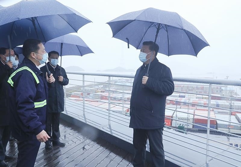 △2020年3月29日,習(xí)近平總書記在浙江寧波舟山港考察調(diào)研??疾旆稻┎蛔?0天,總書記在中央財經(jīng)委員會第七次會議上,首次提出構(gòu)建新發(fā)展格局。