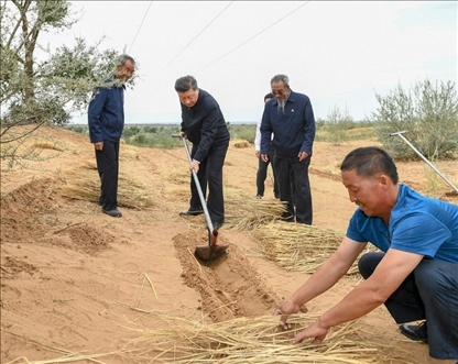 △2019年8月21日,正在甘肅考察的習(xí)近平總書記來到古浪縣八步沙林場??疾熘?,他拿起一把開溝犁,參與到治沙勞動中。