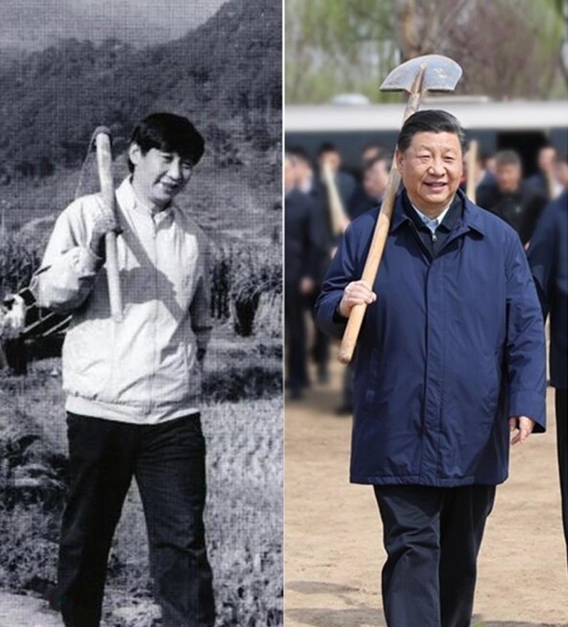 一張是30年后,2019年,總書記參加首都義務(wù)植樹。照片中,他扛著鐵鍬,大步走向植樹地點。