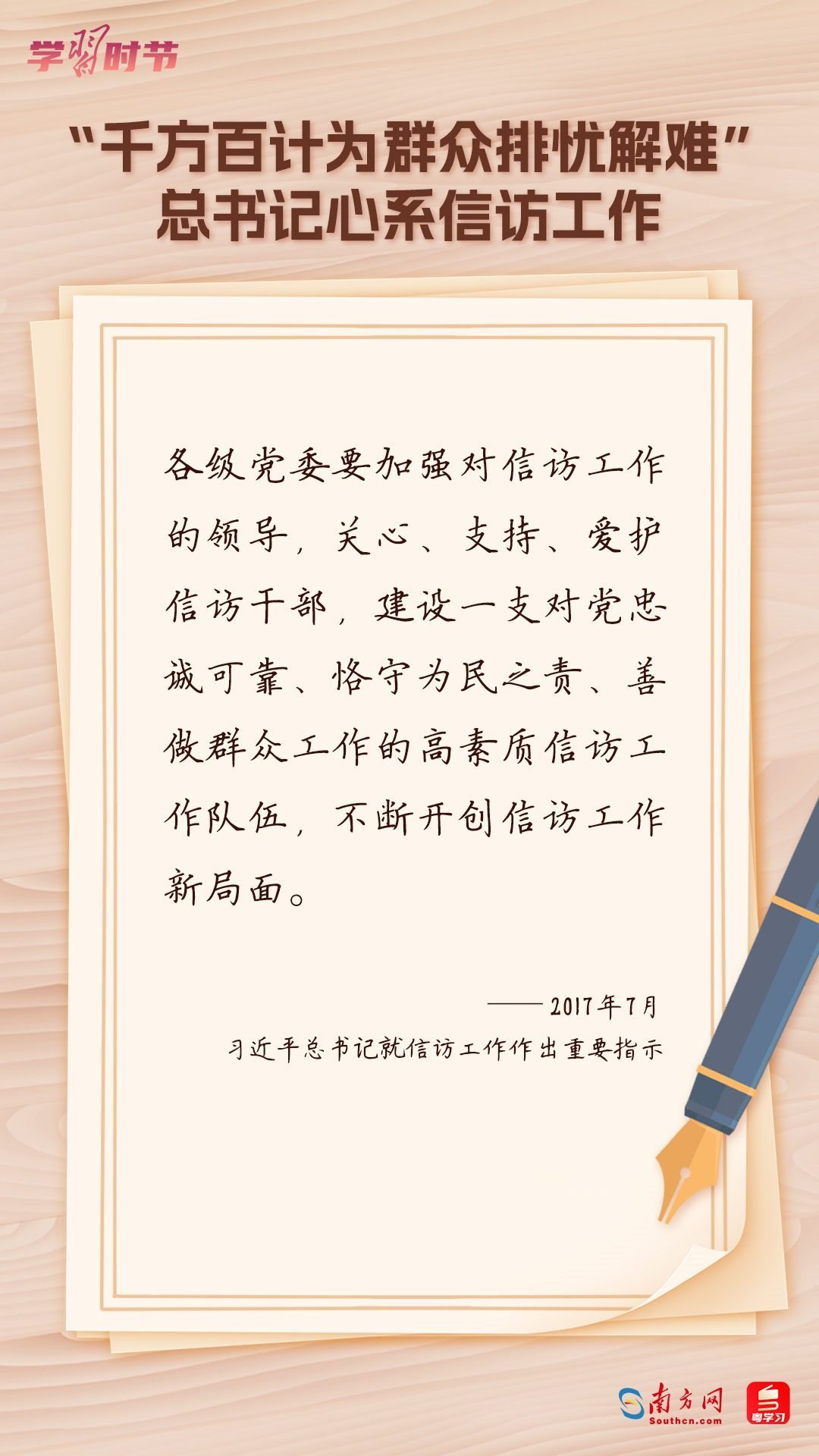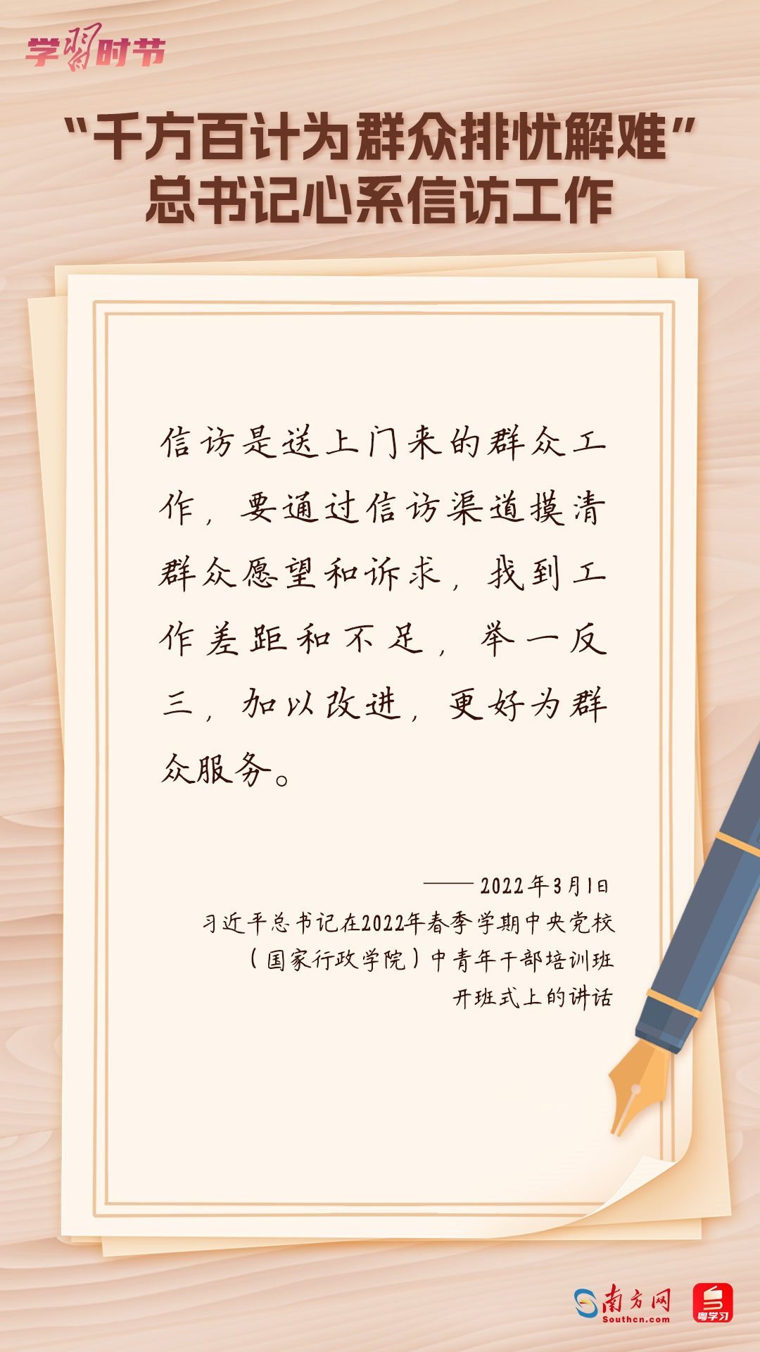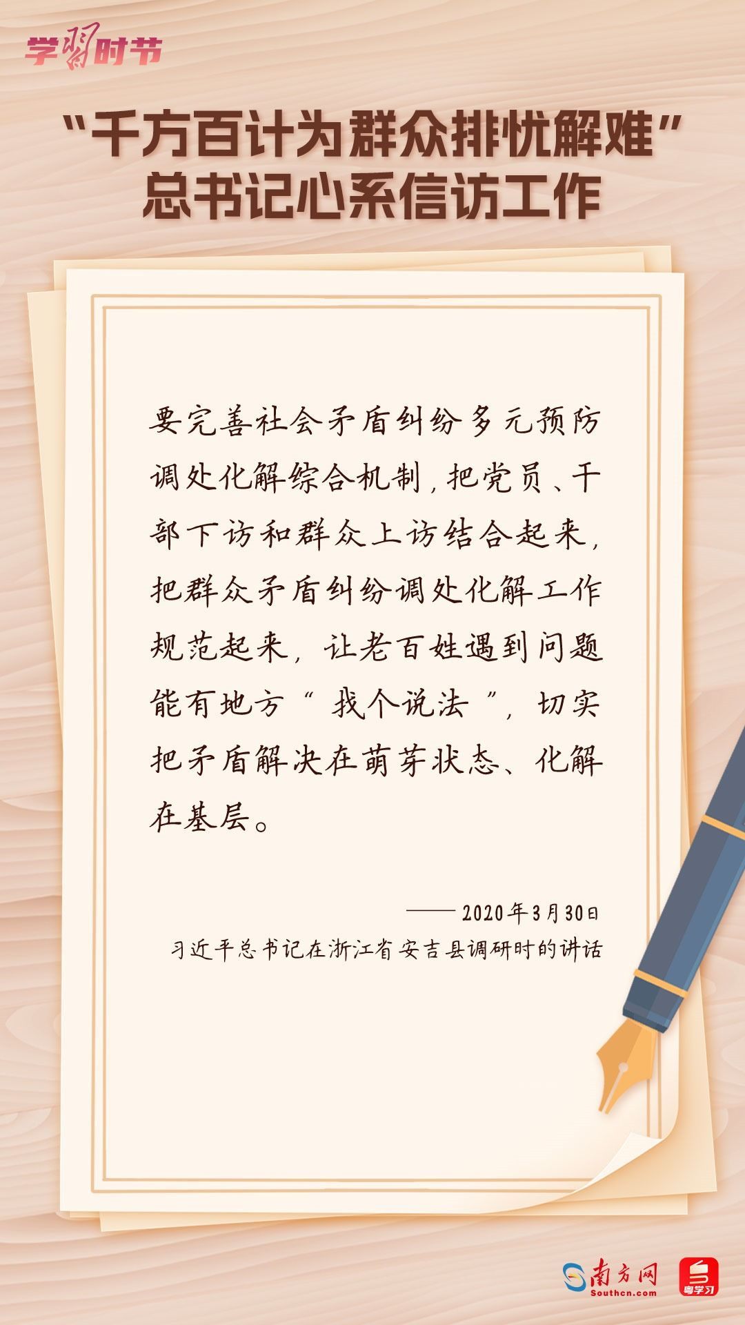 2022年5月1日,中共中央、國務(wù)院印發(fā)的《信訪工作條例》正式實施?!缎旁L工作條例》以習(xí)近平新時代中國特色社會主義思想為指導(dǎo),深入貫徹習(xí)近平總書記關(guān)于加強和改進(jìn)人民信訪工作的重要思想,總結(jié)黨長期以來領(lǐng)導(dǎo)和開展信訪工作經(jīng)驗特別是黨的十八大以來信訪工作制度改革成果,堅持和加強黨對信訪工作的全面領(lǐng)導(dǎo),理順信訪工作體制機制,是新時代信訪工作的基本遵循。今年5月1日是《信訪工作條例》實施一周年,“學(xué)習(xí)時節(jié)”整理摘錄習(xí)近平總書記關(guān)于信訪工作的重要講話和重要指示批示,與您一同學(xué)習(xí)。