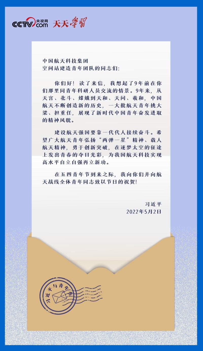 2022年5月2日,在五四青年節(jié)到來(lái)之際,中國(guó)航天科技集團(tuán)空間站建造青年團(tuán)隊(duì)收到了一份特別的節(jié)日禮物——一封落款為“習(xí)近平”的回信。