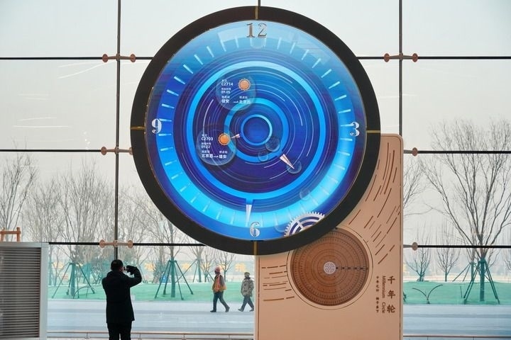 雄安站候車廳,一座“千年輪”吸引著往來旅客的目光。它的起始日期被設(shè)定為2017年4月1日——“雄安”第一次被公眾知曉的日子?!扒贻啞钡牡鬃?,鐫刻著8個金色大字——“千年之計 始于當下”。齒輪不停地轉(zhuǎn)動,記錄下歷史前進的軌跡。
