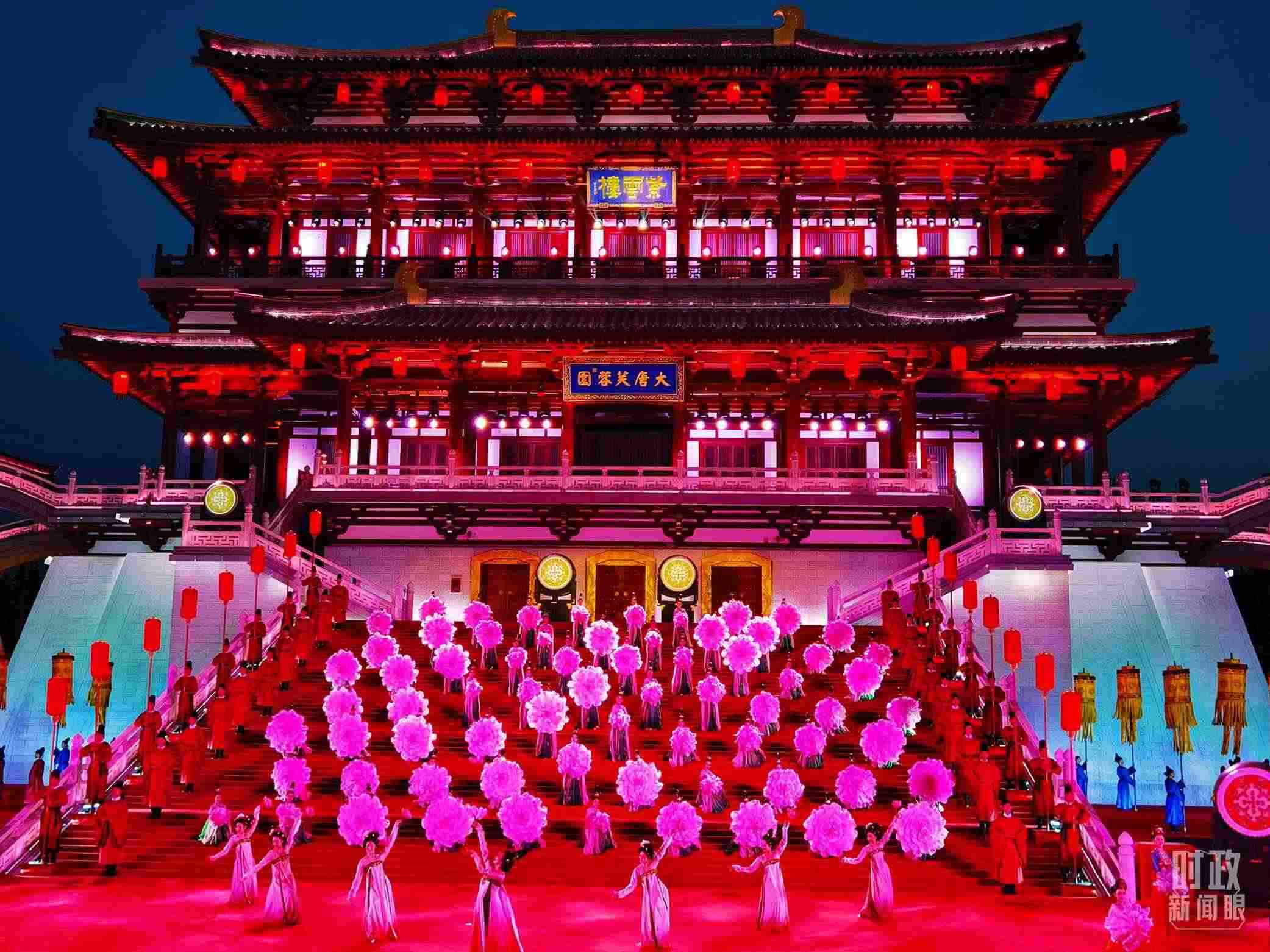 △紫云樓是大唐芙蓉園最主要的仿唐建筑群之一。18日晚的迎賓表演就是以紫云樓為背景。(總臺(tái)央視記者劉琦拍攝)