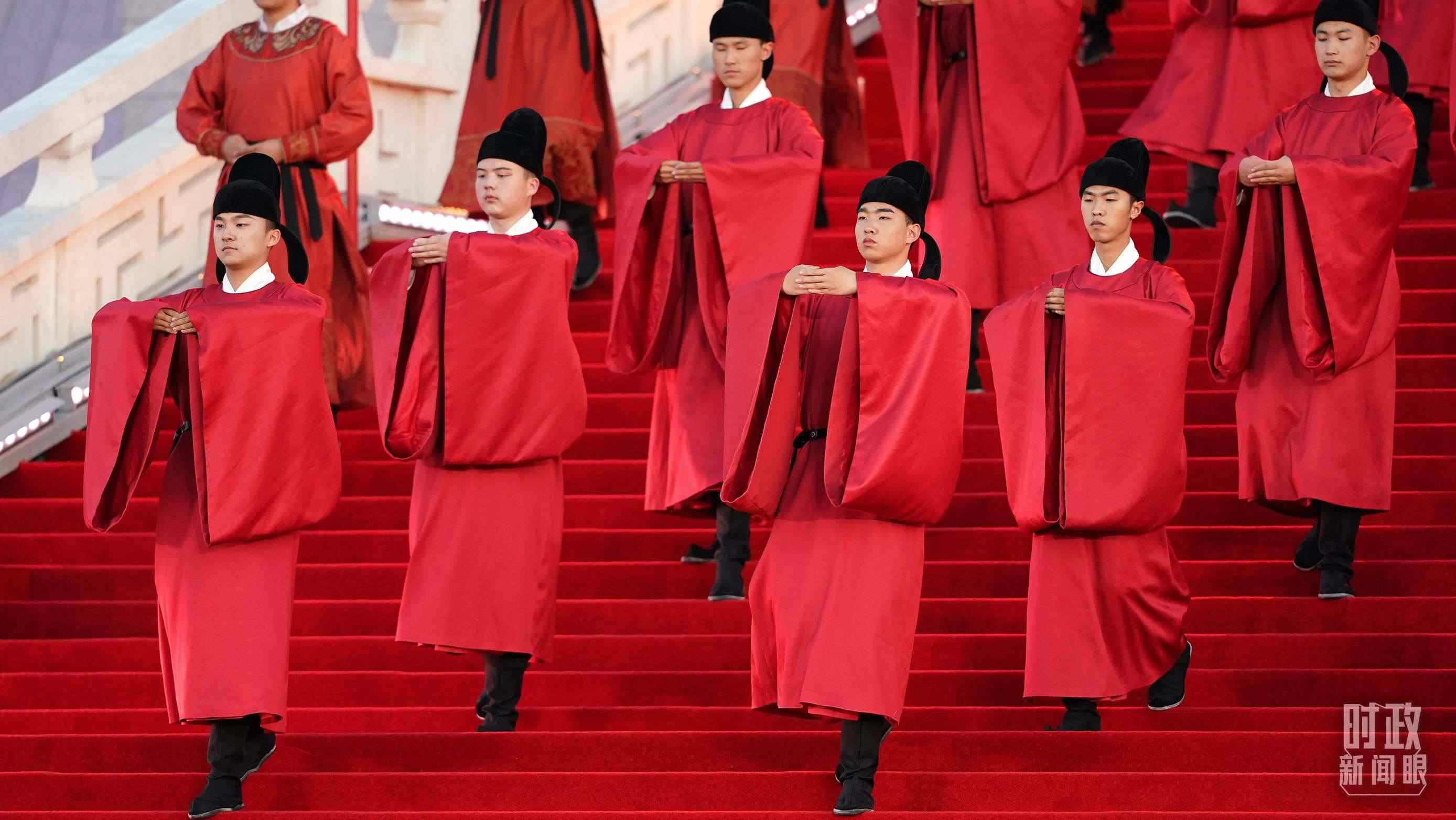 比如,迎賓表演中身著唐代紅色官服的男子,雙手平伸,指尖交錯(cuò),左手在外,掌心向內(nèi),舉手至額,欠身行禮,以中國傳統(tǒng)的“天揖禮”表達(dá)對賓客的敬意。