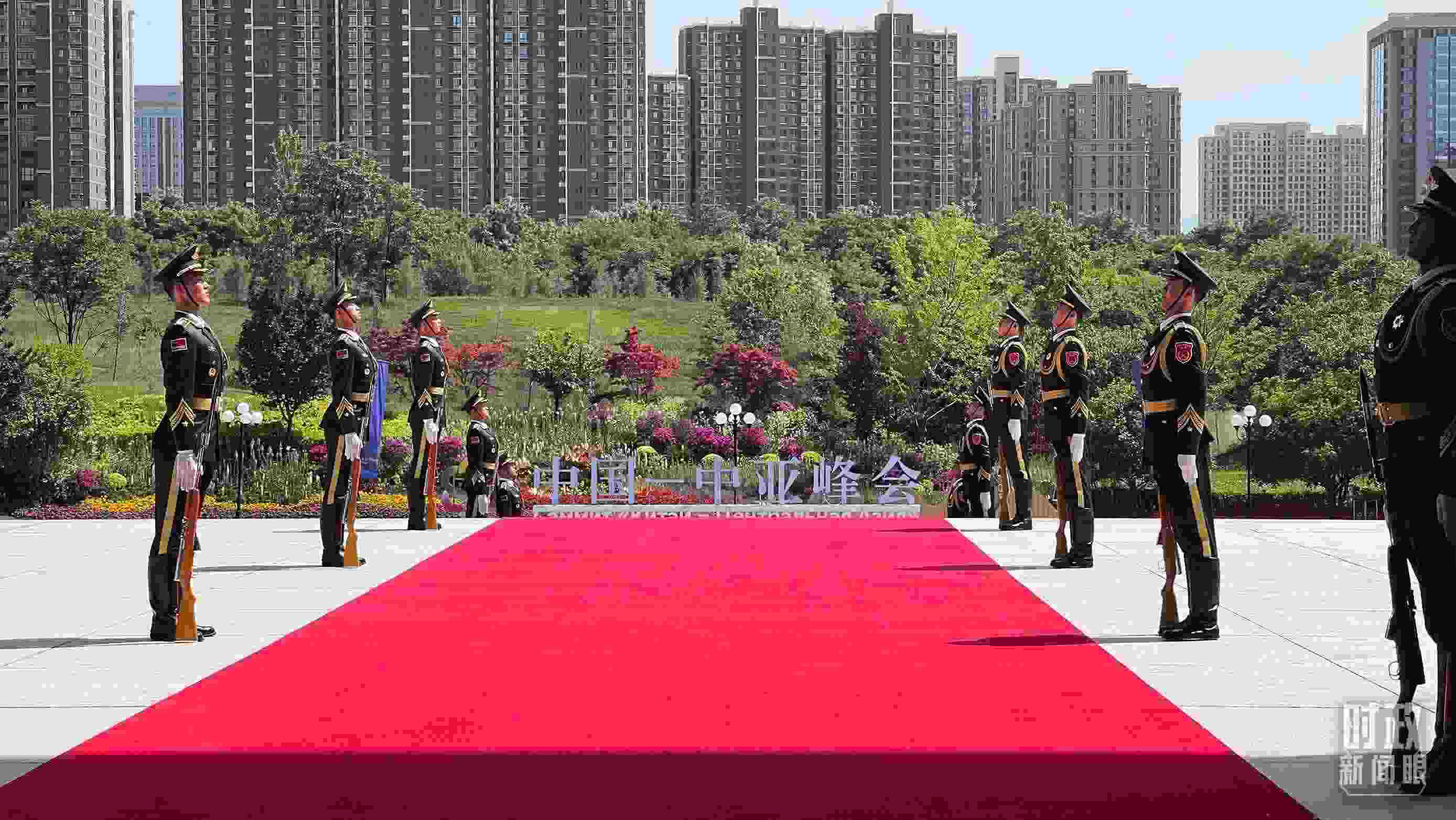 △陜西賓館會議中心外,禮兵列隊(duì)迎接貴賓。(總臺央視記者鐘信偉拍攝)