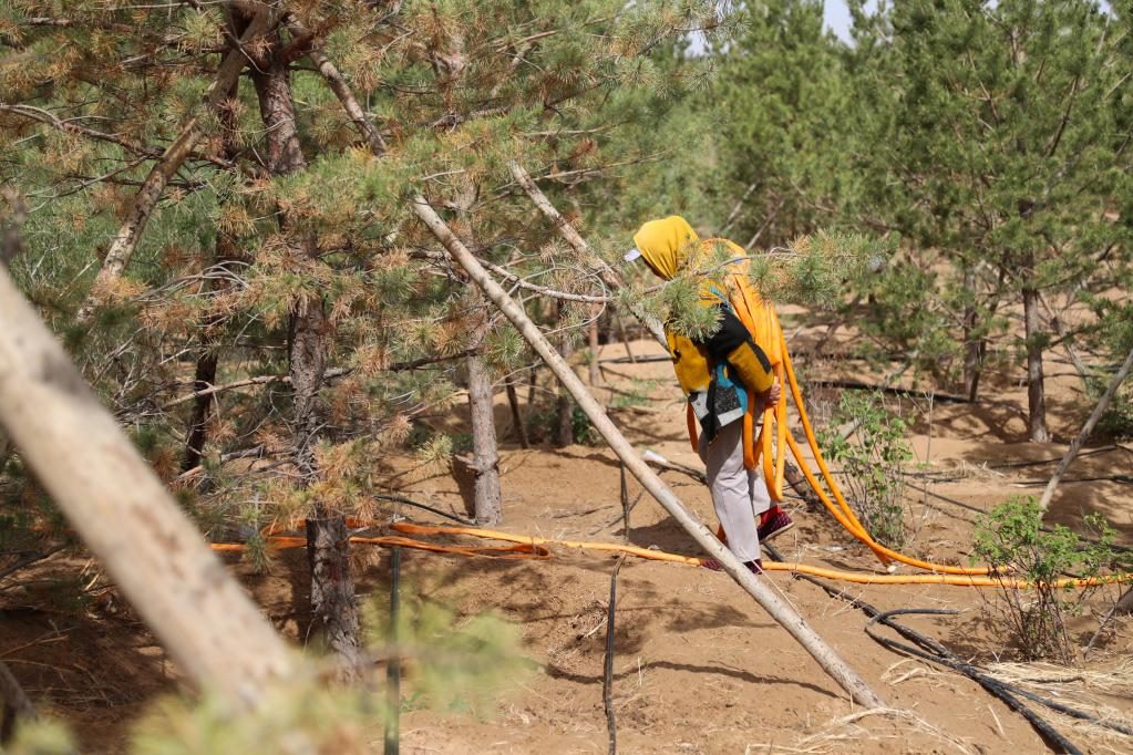 這是2023年5月31日,治沙工人在庫布其沙漠億利生態(tài)治理區(qū)內(nèi)搬運(yùn)水管,準(zhǔn)備為樹木澆水。新華社記者 王楷焱 攝