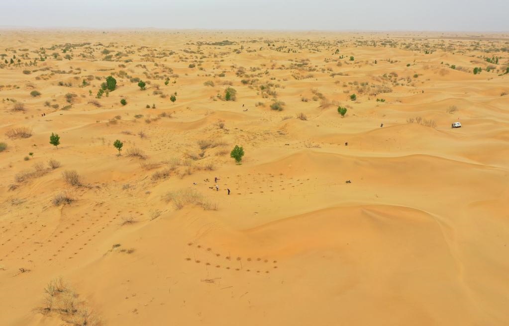 治沙客在內(nèi)蒙古庫布其沙漠億利生態(tài)治理區(qū)種植苗木(2023年4月27日攝,無人機(jī)照片)。新華社記者 劉磊 攝