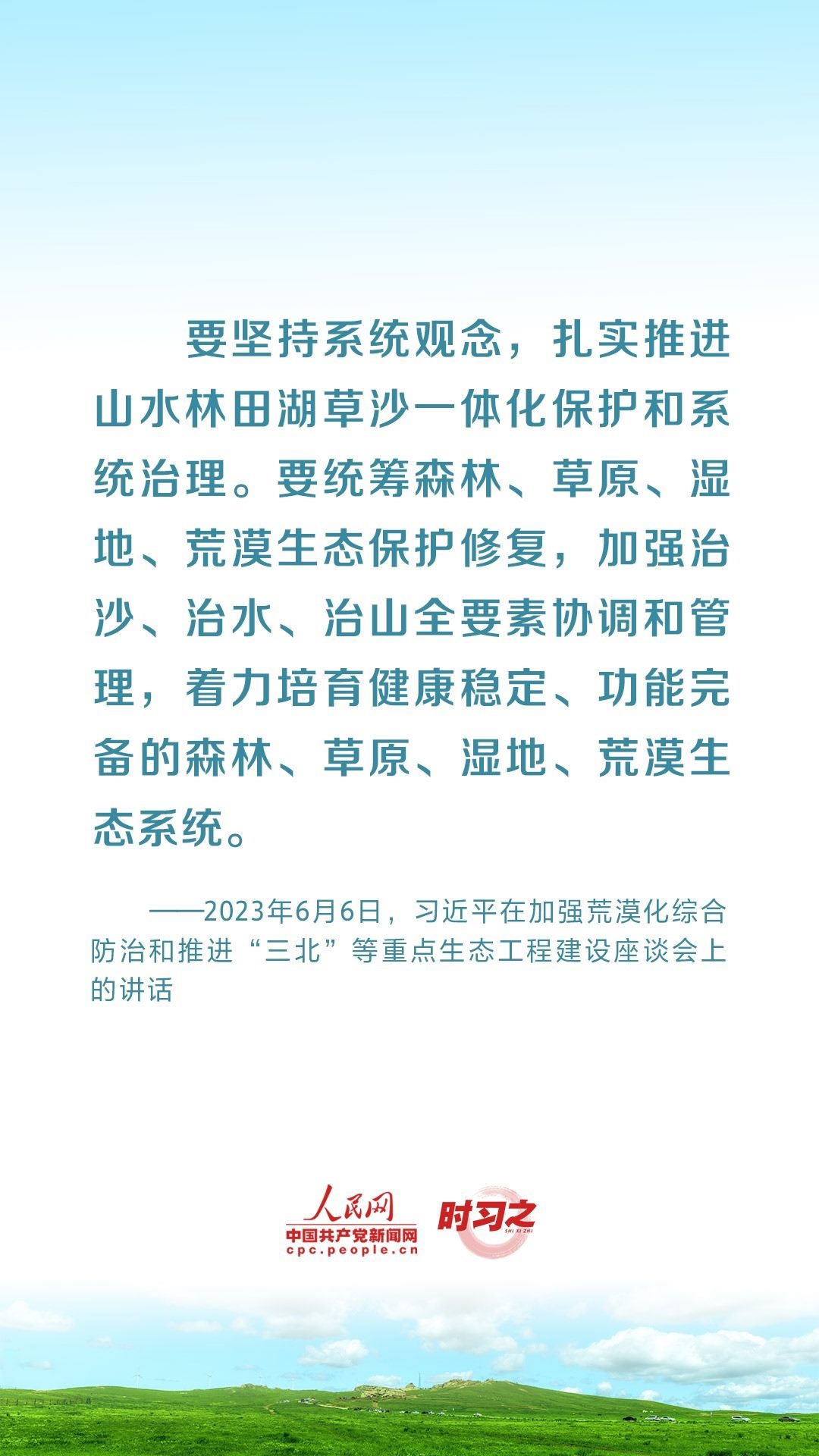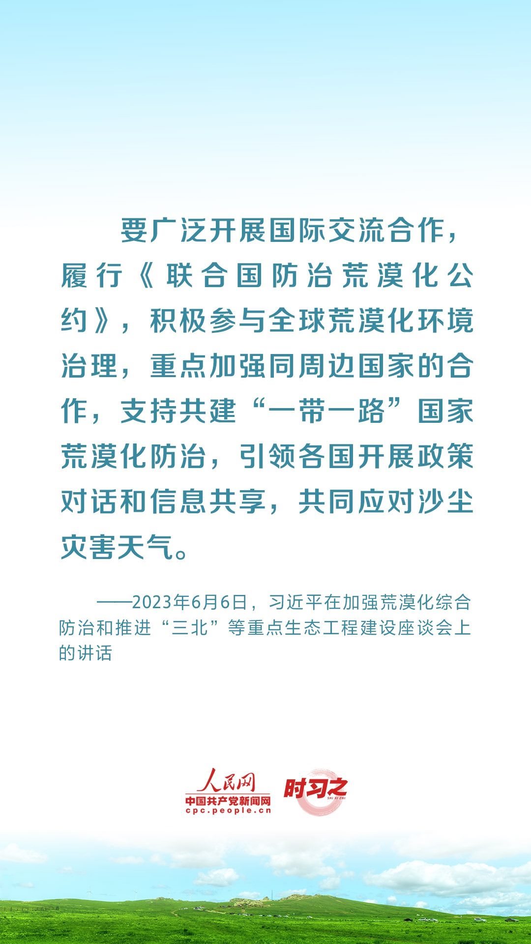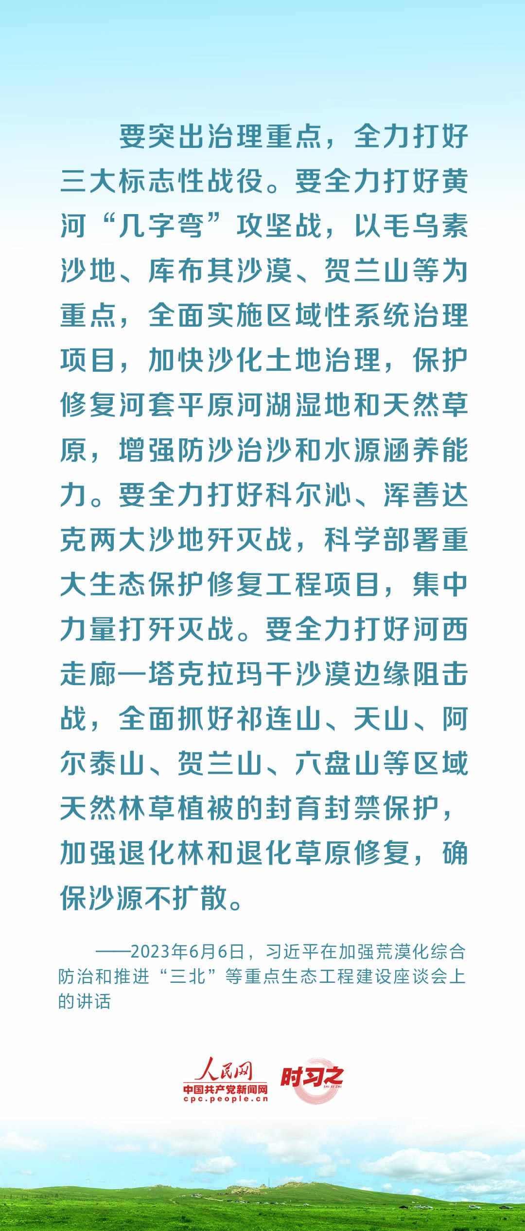 2023年6月5日至6日,中共中央總書記、國家主席、中央軍委主席習(xí)近平在內(nèi)蒙古自治區(qū)巴彥淖爾市考察,主持召開加強(qiáng)荒漠化綜合防治和推進(jìn)“三北”等重點(diǎn)生態(tài)工程建設(shè)座談會(huì)并發(fā)表重要講話。座談會(huì)上,習(xí)近平對走好中國特色防沙治沙道路提出工作要求。
