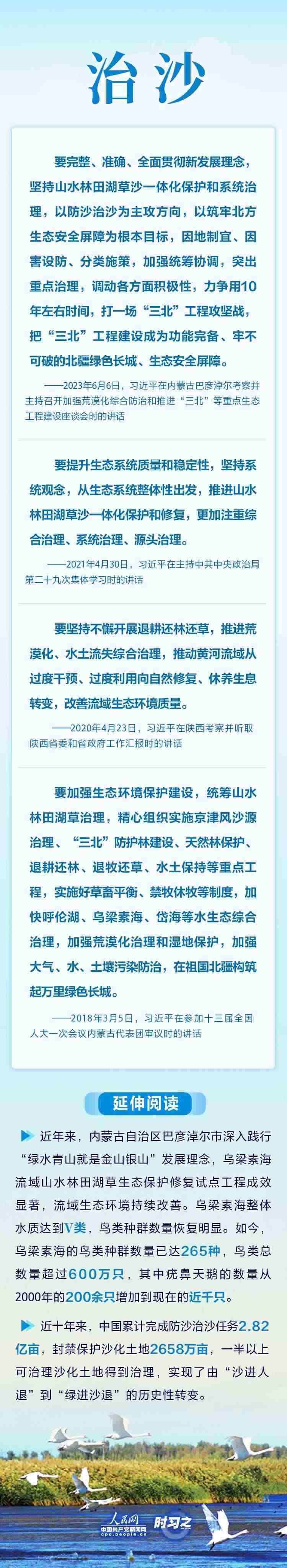 長期以來,在習(xí)近平生態(tài)文明思想的指引下,我國堅持走綠色發(fā)展之路,堅持科學(xué)防沙治沙,創(chuàng)造了“綠色奇跡”。