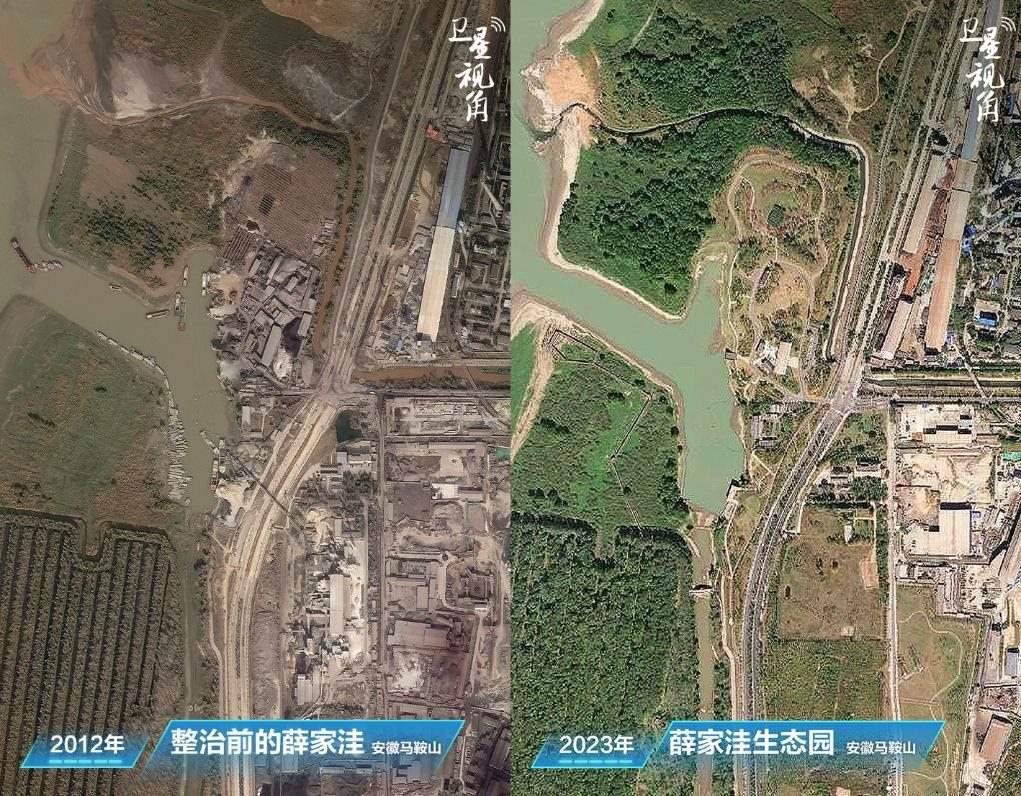 ↑2023年與2012年相比,經(jīng)過整治后的安徽馬鞍山薛家洼生態(tài)園綠意盎然。