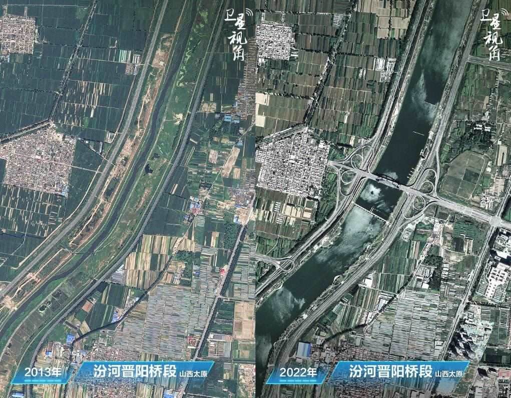 ↑2022年與2013年相比,通過綜合治理和生態(tài)景觀建設(shè),汾河太原城區(qū)晉陽橋段水量更豐、風(fēng)光更美。