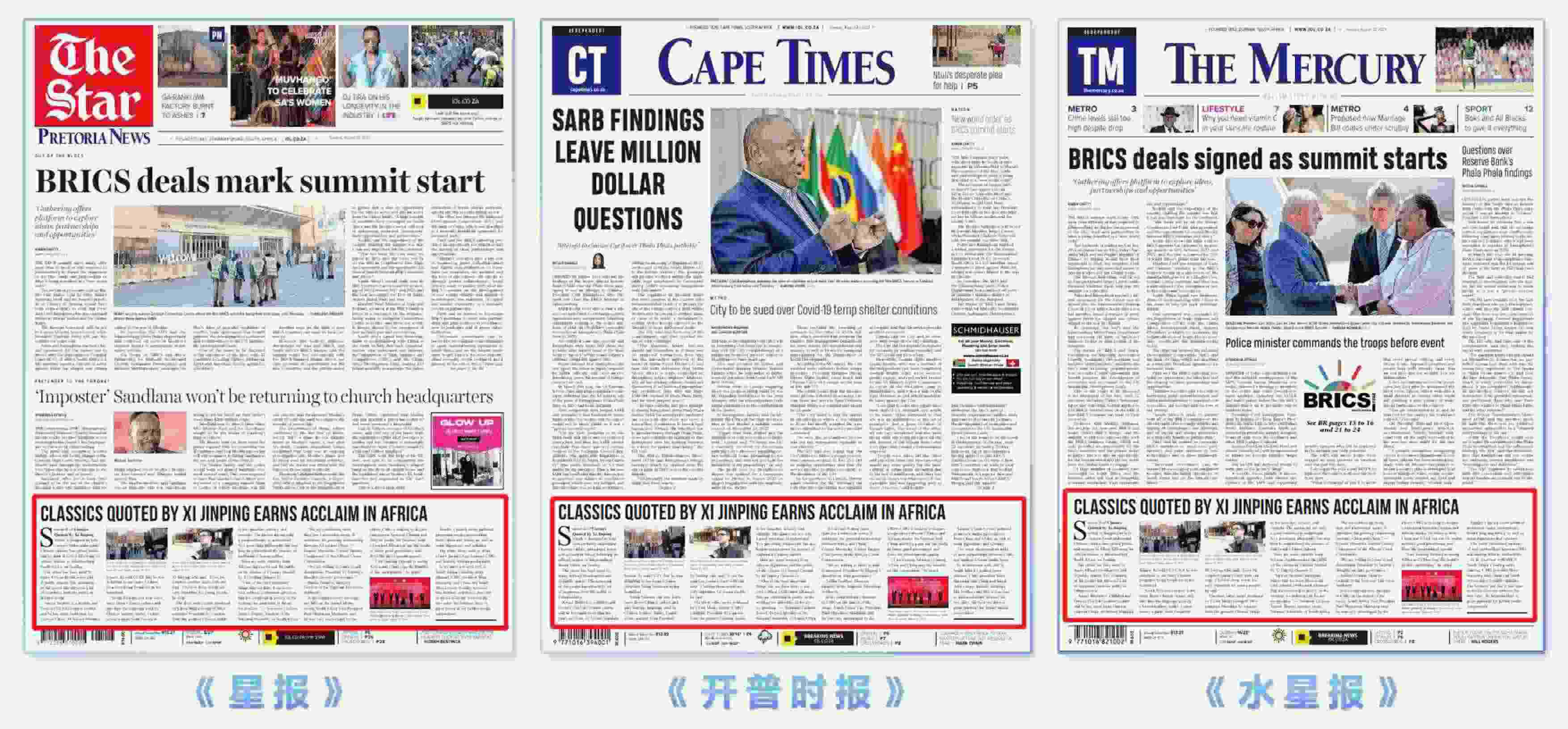 8月22日出版的南非三大主流報刊南非《星報》、《開普時報》、《水星報》,連續(xù)第二天在頭版顯著位置發(fā)表文章。文章指出,《平“語”近人——習近平喜歡的典故》第二季周日(8月20日)在南非約翰內(nèi)斯堡正式發(fā)布后,在非洲贏得了廣泛好評。系列節(jié)目已經(jīng)在多家非洲廣播公司播出,并在公共場所大屏幕展示,這些語錄吸引了大量非洲受眾觀看并獲得積極反響。