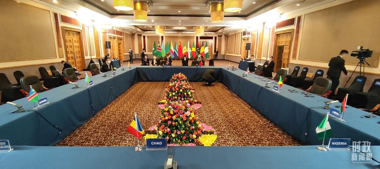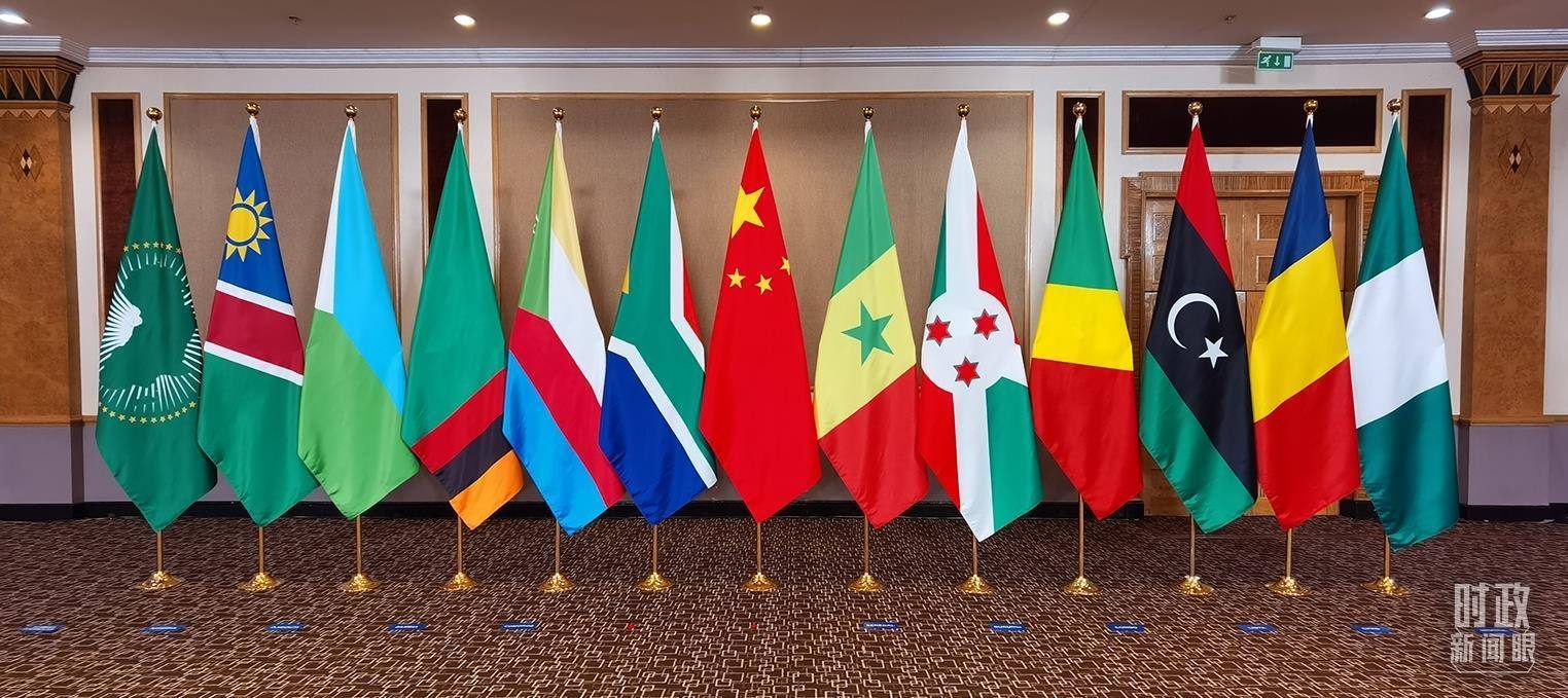 △中非領導人對話會會場擺放的與會各方旗幟。(總臺央視記者郭鴻拍攝)