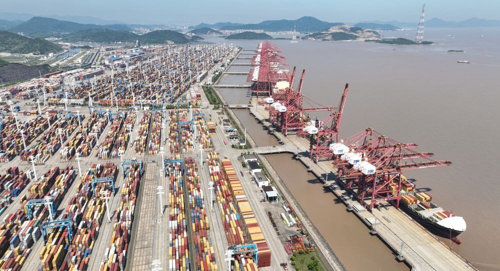 貨輪??吭趯幉ㄖ凵礁鄞┥礁蹍^(qū)裝卸貨物(2023年5月9日攝,無人機照片)。新華社記者 翁忻旸 攝
