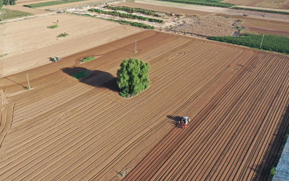8月18日,在河北省涿州市刁窩鎮(zhèn)潘各莊村,農(nóng)民駕駛農(nóng)業(yè)機(jī)械進(jìn)行復(fù)耕補(bǔ)種作業(yè)(無人機(jī)照片)。