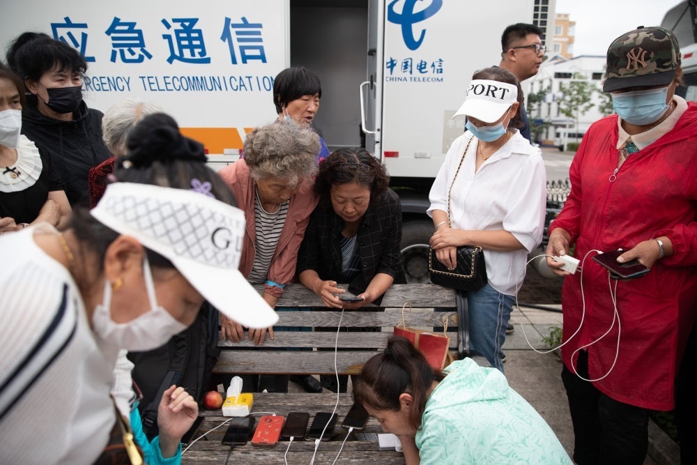 8月6日,群眾在黑龍江省海林市長汀鎮(zhèn)一廣場上的應(yīng)急通信車前與外界通話。