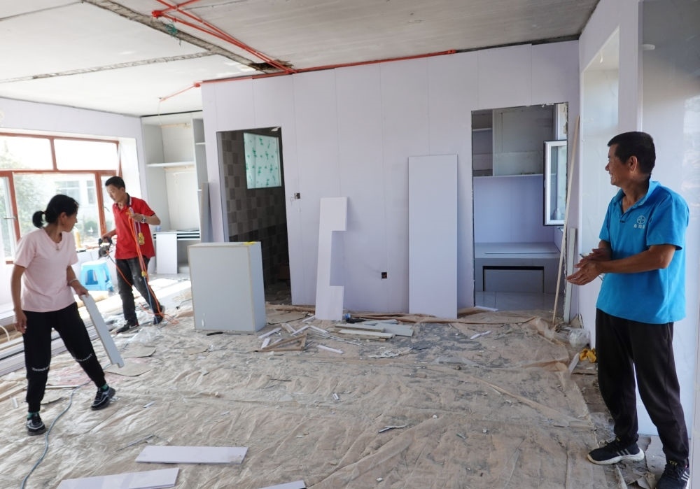 9月7日,黑龍江省尚志市老街基鄉(xiāng)龍王廟村村民包喜文(右)查看受損房屋的裝修進(jìn)度。