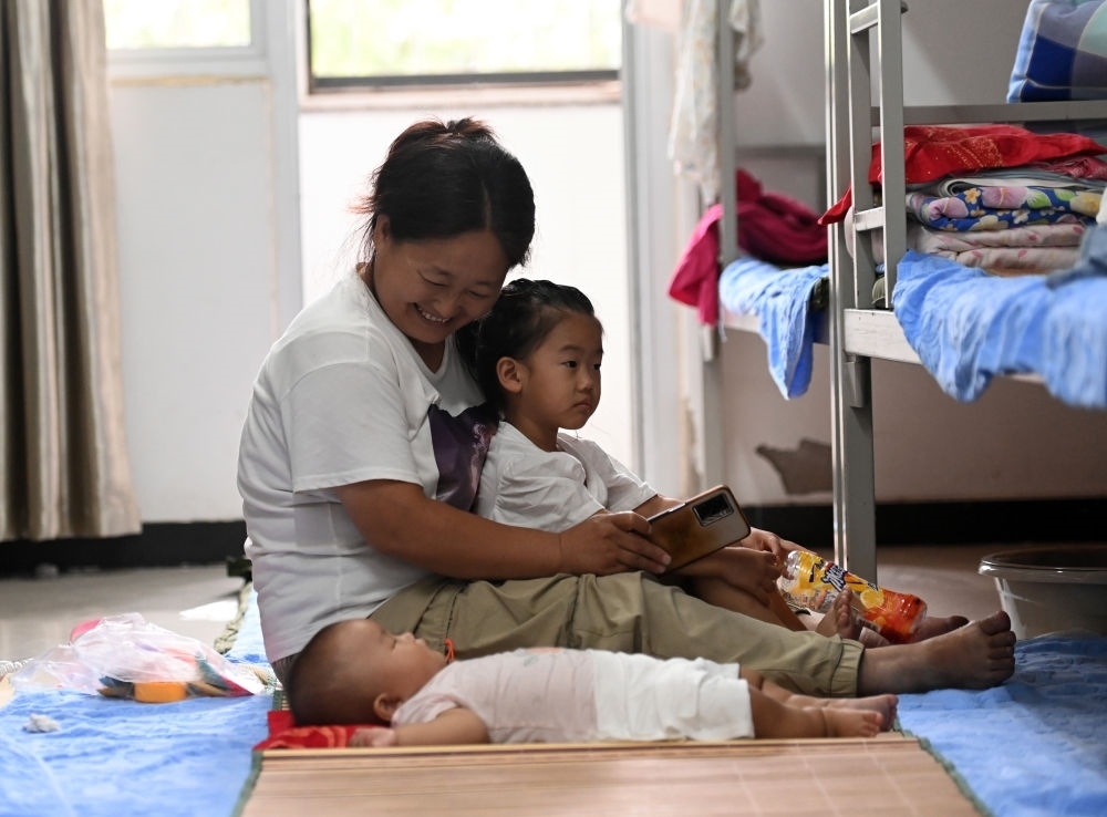 8月12日,在天津市靜海區(qū)大邱莊中學(xué)集中安置點(diǎn),轉(zhuǎn)移群眾在宿舍內(nèi)照看孩子。