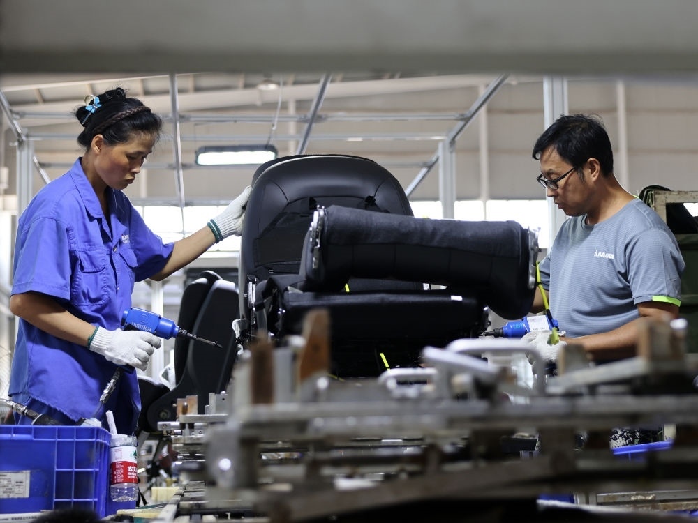 8月19日,工人在位于河北省涿州市的麥格納宏立汽車系統(tǒng)(河北)有限公司生產(chǎn)車間工作。