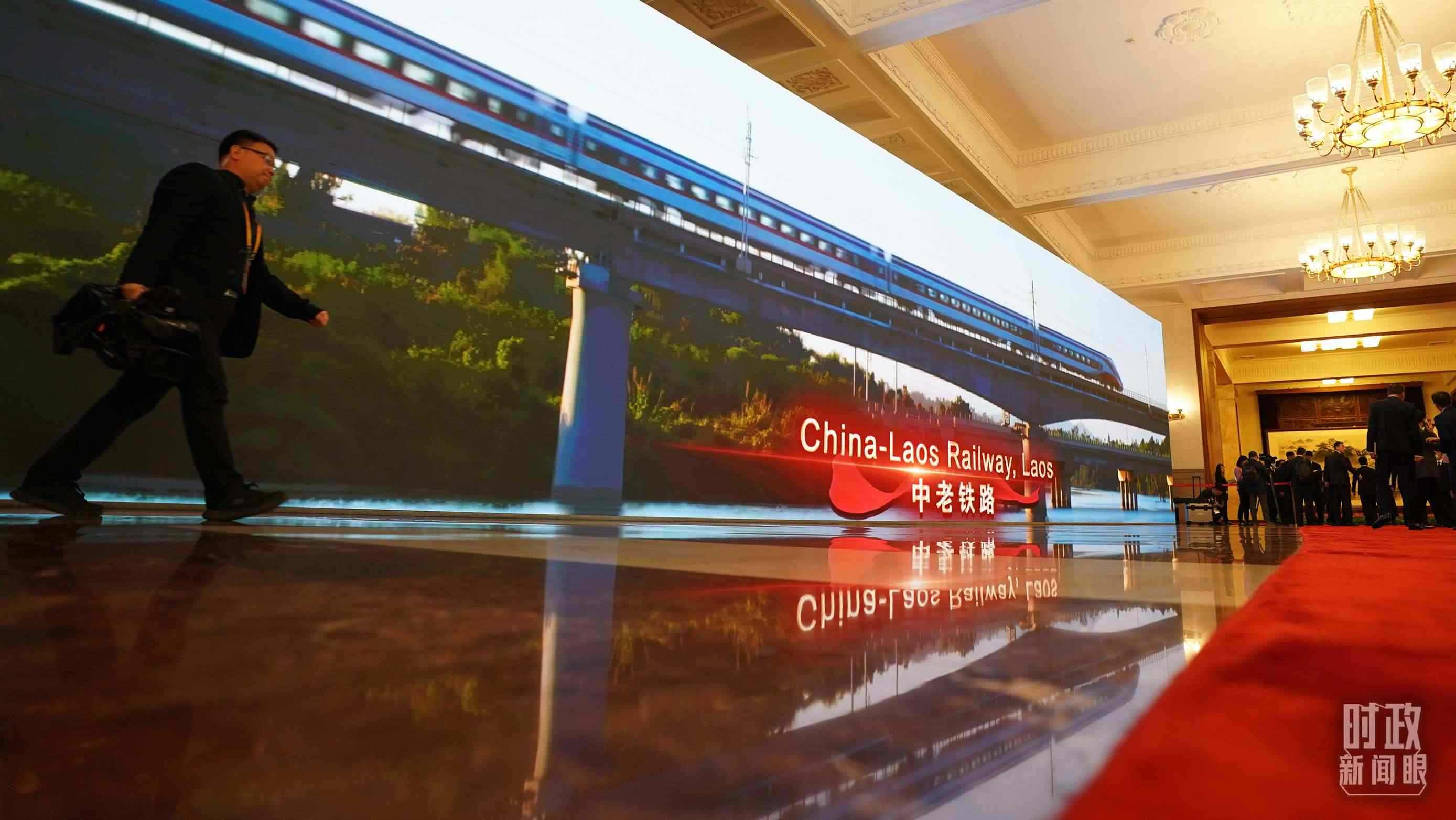 △人民大會堂內(nèi)大屏幕展示共建“一帶一路”合作項目。(總臺國廣記者李晉拍攝)