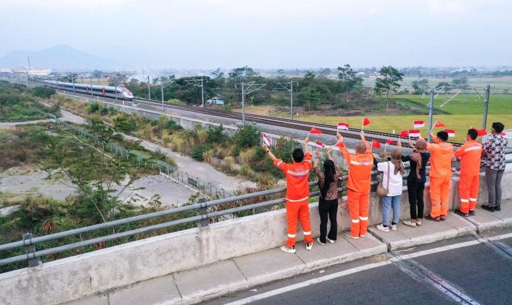△2023年10月17日,在印度尼西亞萬隆一座天橋上,雅萬高鐵中國(guó)建設(shè)者和印尼籍員工揮舞著中國(guó)和印尼兩國(guó)國(guó)旗,向遠(yuǎn)處駛來的一列雅萬高鐵高速動(dòng)車組列車歡呼。