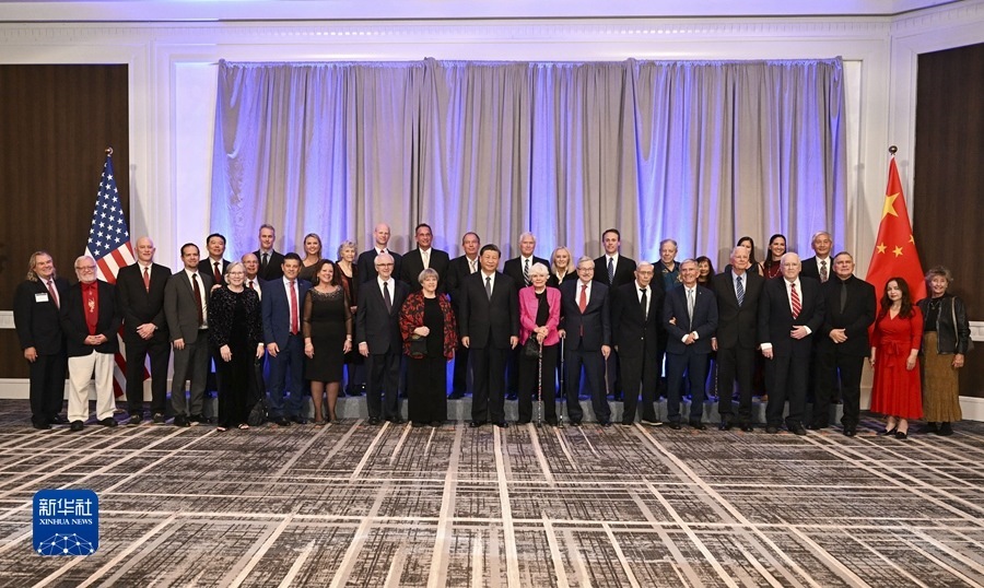 當(dāng)?shù)貢r(shí)間11月15日晚,國(guó)家主席習(xí)近平在美國(guó)舊金山出席美國(guó)友好團(tuán)體聯(lián)合舉行的歡迎宴會(huì)。這是宴會(huì)開始前,習(xí)近平會(huì)見飛虎隊(duì)和史迪威將軍后人、鼓嶺、艾奧瓦州、華盛頓州等方面友好人士代表,同他們親切交談并合影留念。新華社記者 謝環(huán)馳 攝 圖片來源:新華網(wǎng)