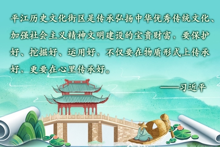 2023年7月6日上午,習近平總書記來到位于蘇州古城東北隅的平江歷史文化街區(qū)考察調(diào)研。他說:“住在這里很有福氣,古色古香,到處都是古跡、到處都是名勝、到處都是文化。‘百步之內(nèi),必有芳草’,這句話可以用在這里?!?/p>