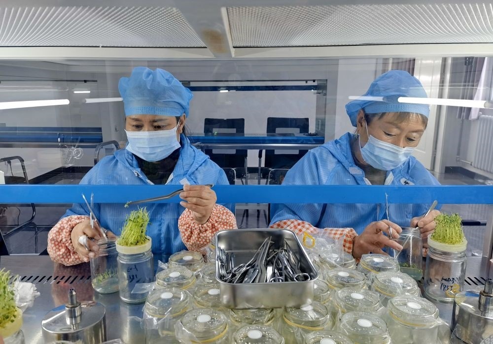 技術(shù)人員在河北省張家口市德勝村一處育種室內(nèi)培育微型馬鈴薯瓶苗(2024年2月4日攝)。新華社發(fā)
