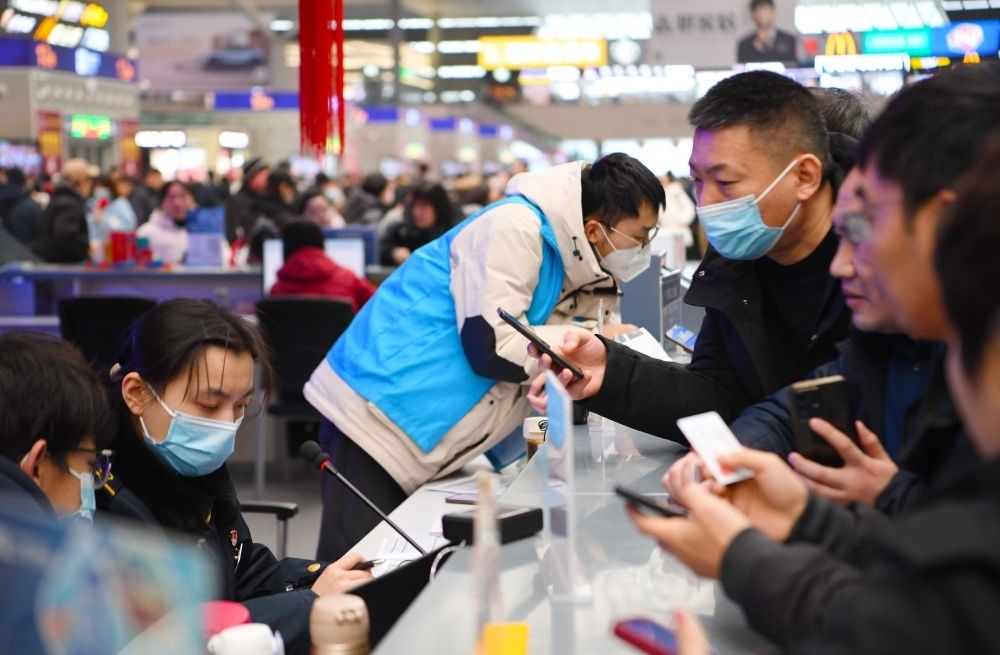 在鄭州東站候車大廳“心馨”黨員服務(wù)臺,旅客在咨詢乘車事宜(2024年2月1日攝)。新華社記者 郝源 攝