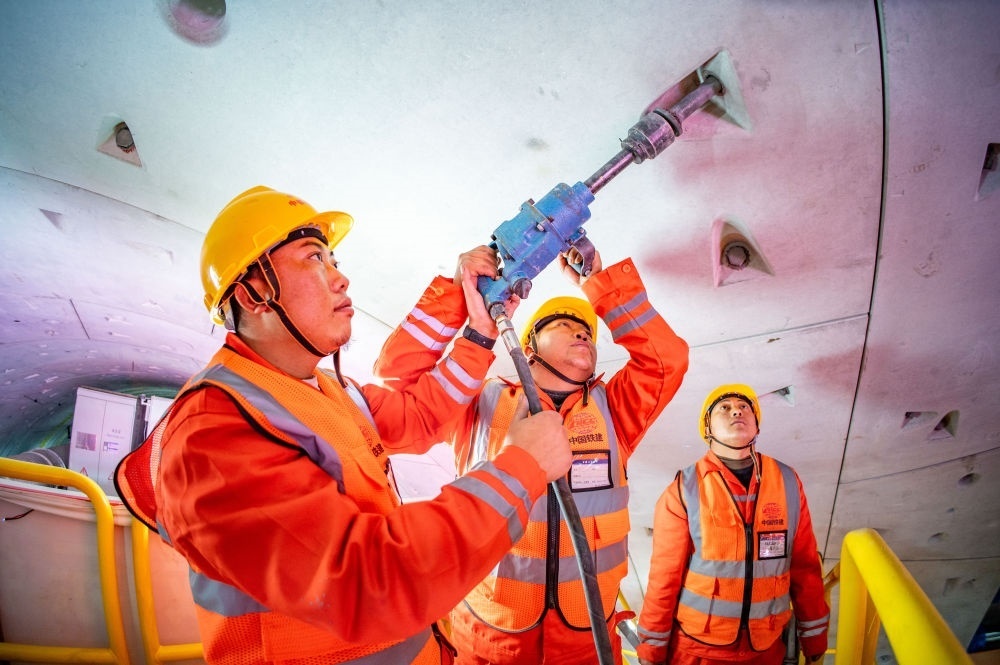 在中鐵十四局京唐城際鐵路運(yùn)潮減河隧道內(nèi),施工人員在拼裝管片(2024年2月4日攝)。新華社發(fā)(中鐵十四局供圖)
