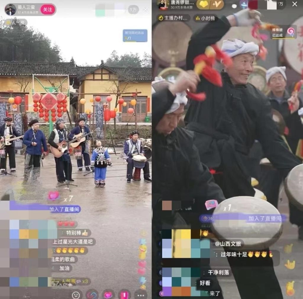 湖南省鳳凰縣臘爾山鎮(zhèn)苗寨中,4個(gè)“90后”苗族小伙組成樂隊(duì)自辦“村晚”,規(guī)模不大,唱火家鄉(xiāng);山西臨汾的村民們用簸箕、黃豆當(dāng)樂器,配合嗩吶和非遺晉南威風(fēng)鑼鼓,直播連線上千公里外的苗鄉(xiāng),南北大聯(lián)歡釋放獨(dú)特的精彩,吸引在線觀眾近800萬人……