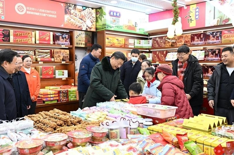 歷史悠久的桂發(fā)祥十八街麻花、果仁張的店鋪里,顧客絡(luò)繹不絕。2月1日,習(xí)近平總書記走進(jìn)店里,問品種、問客流、問價(jià)格,還掏錢買了幾盒麻花和栗子羹,送了兩盒給身旁的一名小男孩。