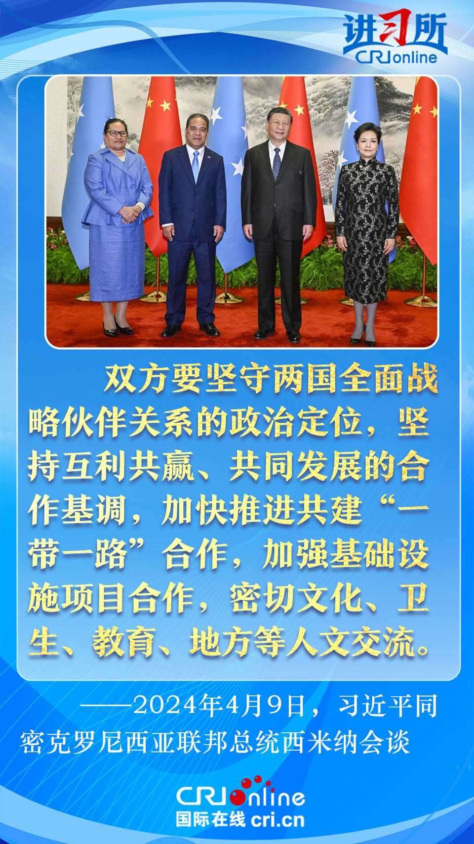 4月9日下午,中國國家主席習(xí)近平在北京同密克羅尼西亞聯(lián)邦總統(tǒng)西米納舉行會談,此訪是西米納總統(tǒng)就任以來首次訪華,兩國領(lǐng)導(dǎo)人就雙邊關(guān)系發(fā)展及共同關(guān)心的問題深入交換意見。