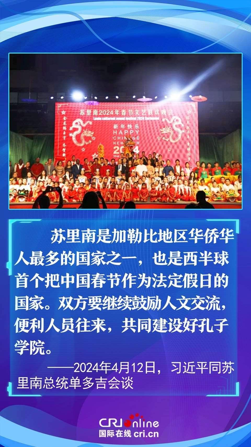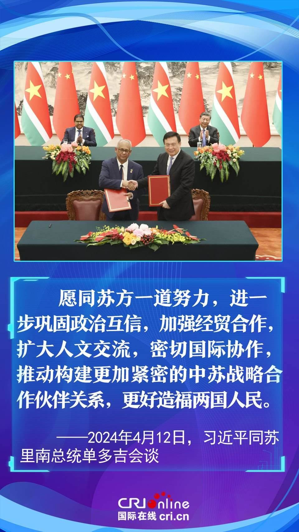 今年是中國和蘇里南建立戰(zhàn)略合作伙伴關(guān)系五周年。習(xí)近平主席在會談中以“源遠流長、歷久彌堅”為中蘇友誼增添了新的注解,為推動構(gòu)建更加緊密的中蘇戰(zhàn)略合作伙伴關(guān)系指明了方向。