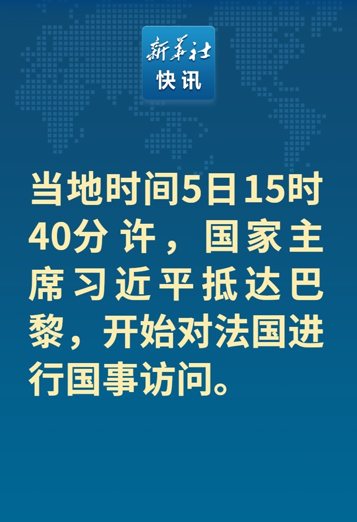 新華社快訊:當(dāng)?shù)貢r(shí)間5日15時(shí)40分許,國家主席習(xí)近平抵達(dá)巴黎,開始對法國進(jìn)行國事訪問。