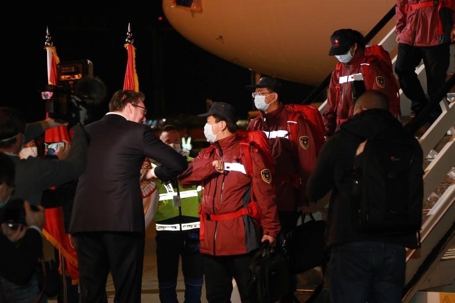 中國醫(yī)療團(tuán)隊(duì)在貝爾格萊德尼古拉·特斯拉機(jī)場降落時(shí)已是深夜。武契奇率領(lǐng)塞方多名高級(jí)官員到機(jī)場迎接。疫情期間不建議握手,于是這位塞爾維亞領(lǐng)導(dǎo)人選擇和中國專家團(tuán)成員一一碰肘以示尊重。對中國的及時(shí)支援心懷感激,他還在機(jī)場親吻了一面五星紅旗。