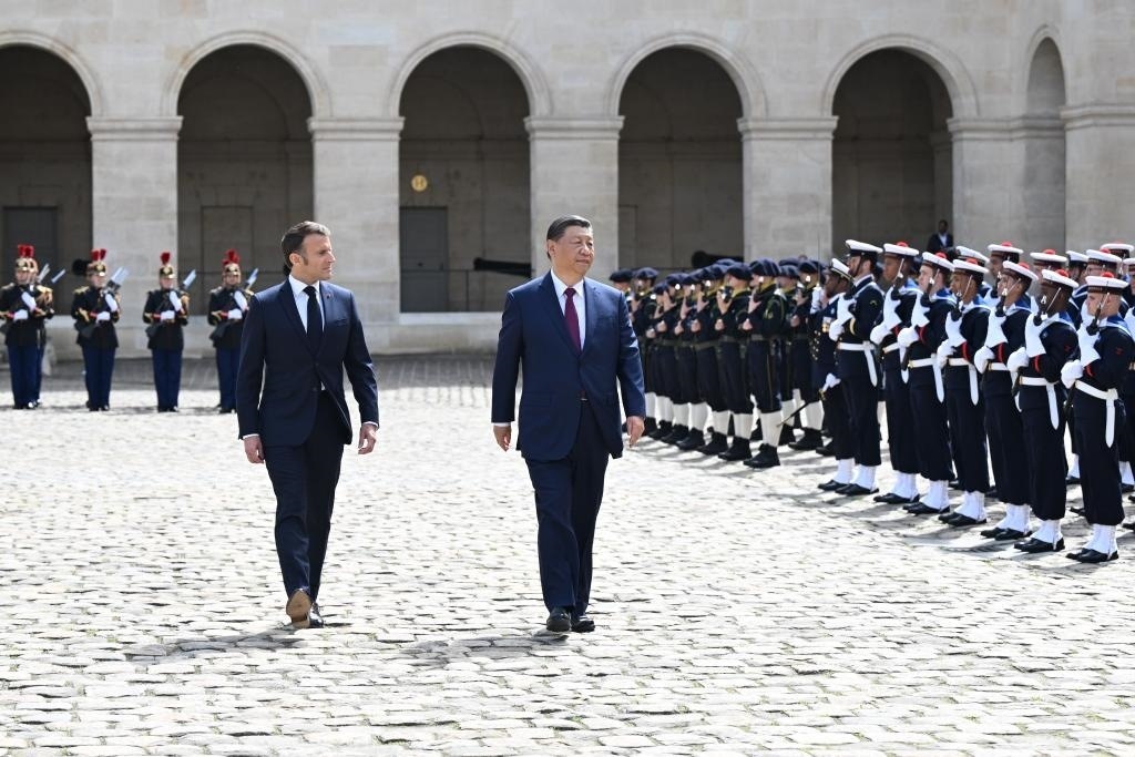 當(dāng)天下午,習(xí)近平在巴黎出席馬克龍舉行的隆重盛大歡迎儀式。兩國元首檢閱法蘭西共和國衛(wèi)隊和陸海空三軍儀仗隊,并觀看分列式。