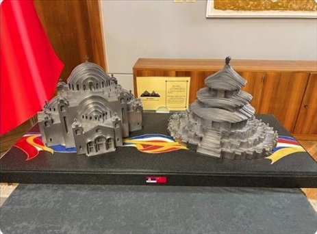 習近平主席送給武契奇兩件工藝品,分別是鋼材質的天壇和圣薩瓦教堂造型。